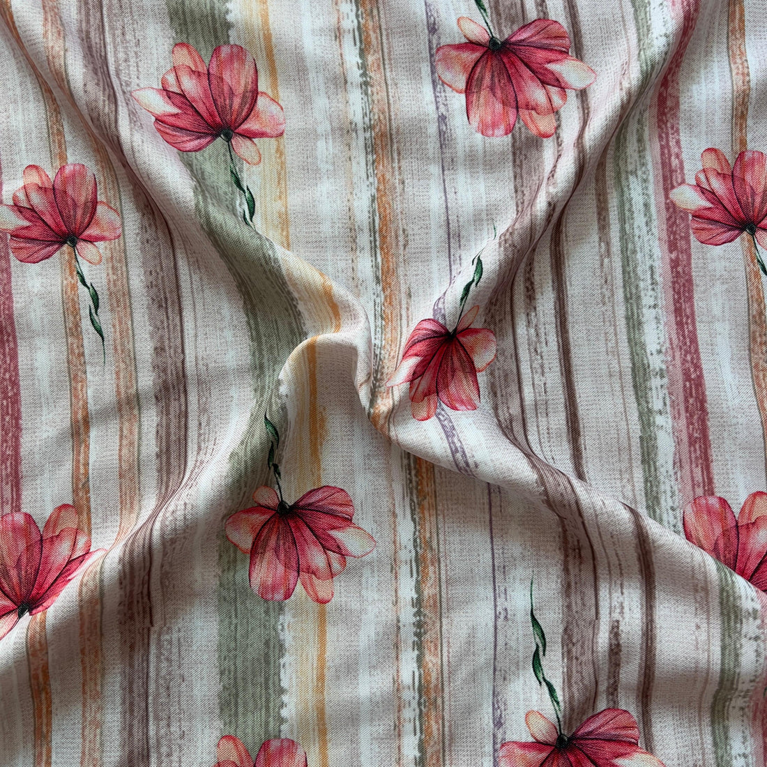 Floral print with geometric stripe ground on rayon