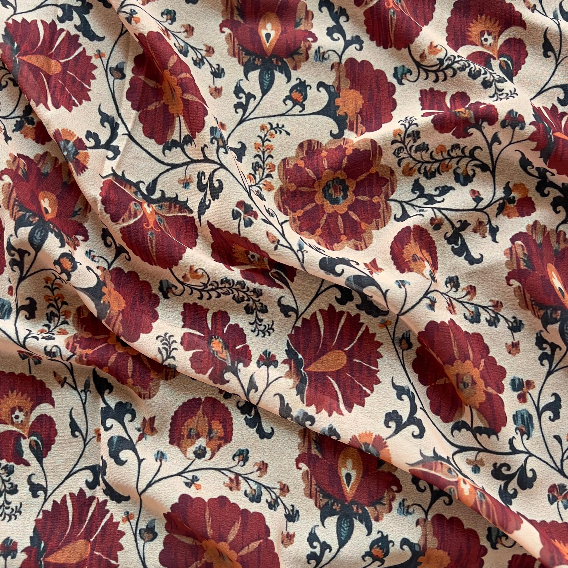 This traditional ethnic print on georgette features a cre ground design, combining cultural elements with modern style. Made from high-quality material, it offers a classic and elegant look while providing comfort and durability. Perfect for adding a touch of tradition to any outfit.