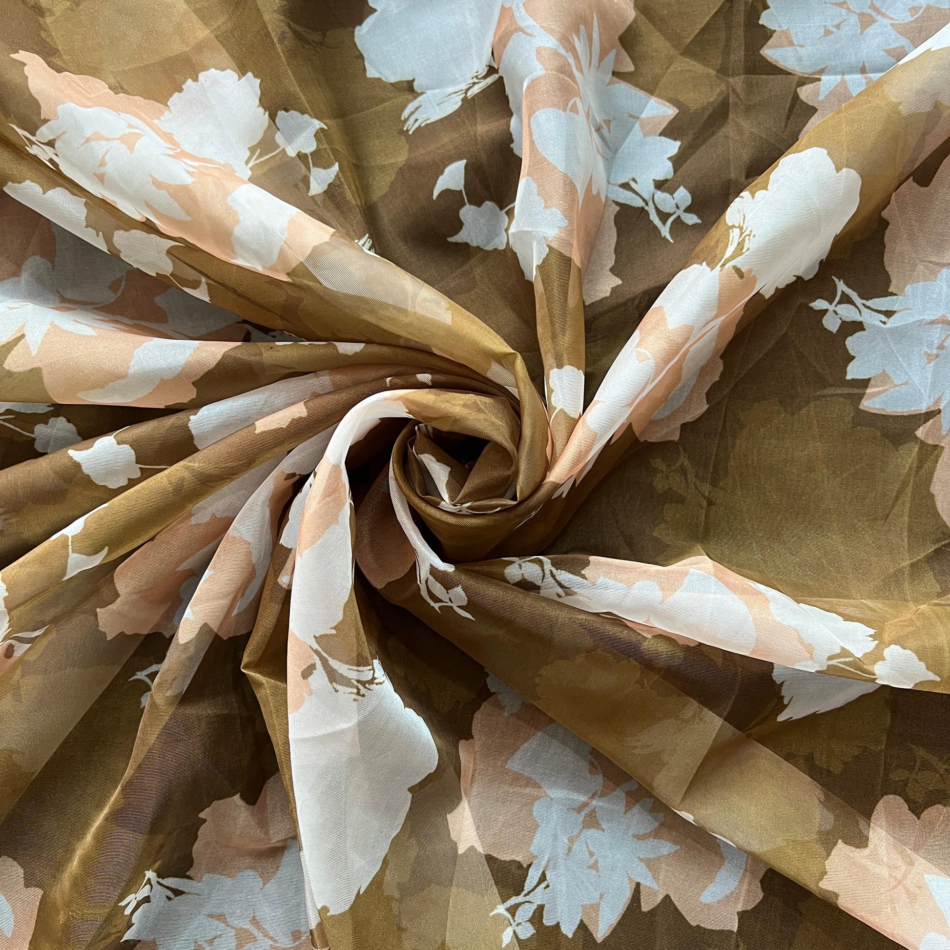 This floral print on tabby fabric features a vibrant mustard color. The unique print adds a touch of elegance to any garment or home decor item. Stand out with this eye-catching design and elevate your style.