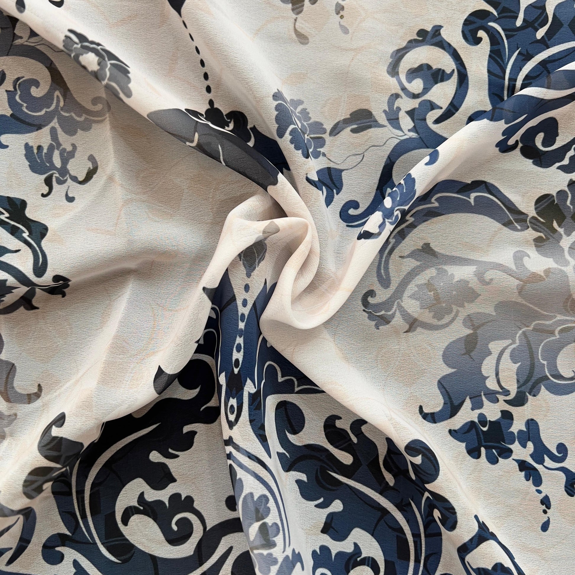 This elegant georgette fabric features a seamless damask pattern accented with classic stock designs. The result is a luxurious and timeless aesthetic, perfect for sophisticated fashion pieces or home decor accents. Made with high-quality materials, this fabric offers both style and durability.